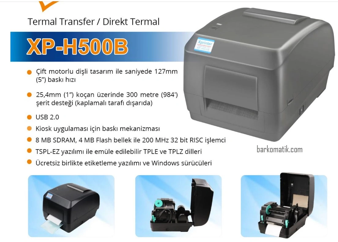 XPRİNTER XP-H500B, Thermal Transfer (TT) baskı teknolojisine sahip, USB, Seri ve LAN bağlantı seçeneklerine sahip bir barkod yazıcı modelidir. Bu yazıcı, etiket baskı işlemleri için yüksek verimlilik sunar ve özellikle perakende, lojistik, depo yönetimi ve endüstriyel kullanım gibi farklı alanlarda tercih edilmektedir. Thermal Transfer (TT) teknolojisi sayesinde, dayanıklı ve uzun ömürlü etiketler üretebilirsiniz.